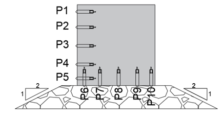 Para medir la transformación del oleaje se colocaron 21 sensores de nivel tipo resistivo fabricados por VTI, utilizando una frecuencia de muestreo de 100 Hz (Figura 5). Asimismo, se realizaron mediciones de presión con 10 sensores colocados alrededor de la estructura (Figura 6) para la medición de presiones y subpresiones (cinco en el muro vertical y cinco en la base). Los sensores utilizados fueron marca Keller America, con una precisión de ±0.25 % o ±0.1% TEB; un intervalo de presión de 0 a 39 225.53 Pascales, y un intervalo de temperatura de -10 a 80 °C. En los ensayos 2 y 3 se utilizó una frecuencia de muestreo para la presión de 19 Hz. Las frecuencias de muestreo utilizadas para cada variable estuvieron en función de la frecuencia de muestreo de los sensores de medición. Por otro lado, para medir el nivel de agua en la cubeta de rebase y estimar el volumen de rebase y gasto, se empleó un sensor resistivo, acústico y de presión.