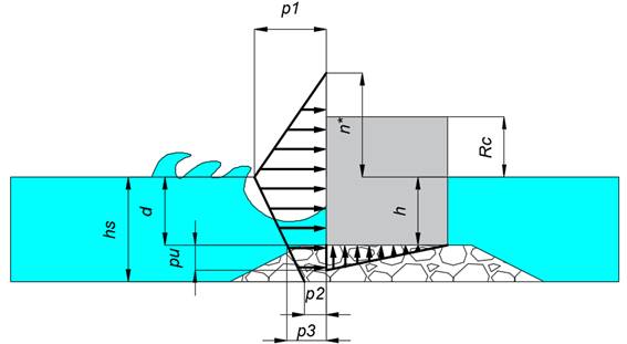 Para el estudio de estabilidad, ante oleaje pulsante, se utilizó el modelo de Goda (1974). Este modelo utiliza para el cálculo de la sobreelevación y las presiones las siguientes expresiones: