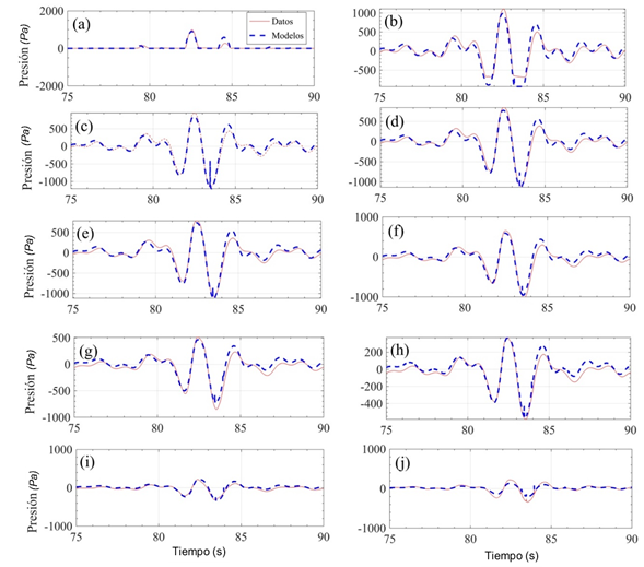Figura 9 Comparación de la serie temporal de presiones entre las mediciones y el modelo numérico en los sensores ubicados en: la cara barlomar del dique (a: P1; b: P2; c: P3; d:P4; e: P5) y en la base del dique (f: P6; g: P7; h: P8; i: P9; j: P10). La ubicación de los sensores se detalla en la Figura 6