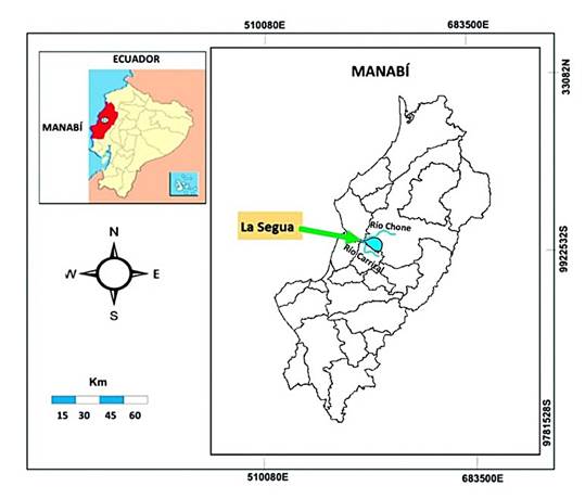 El objeto de esta investigación es el humedal de La Segua, ubicado entre los cantones de Chone y Tosagua, en la provincia de Manabí, Ecuador (Figura 1), caracterizado como zona húmeda con categoría internacional de sitio Ramsar desde el 7 de junio del año 2000 y como área protegida provincial más recientemente. El territorio principal de este espacio y el de mayor nivel de accesibilidad y conservación pertenece desde el punto de vista político-administrativo a la parroquia de San Antonio; tiene una extensión de 1 745 ha. Se trata de una lámina de agua muy estacional, de manera que en la época seca se reduce a unas 525 ha. Cuenta, por lo demás, con una profundidad media de 67 cm; altitud sobre el nivel del mar de unos 10 a 12 cm; la temperatura media es de 26 a 27 ºC. El humedal La Segua está integrado en el corredor hídrico Carrizal-Chone, en la región centro norte de la provincia de Manabí, y a pocos kilómetros de la desembocadura del río Chone, en la bahía de Caráquez.