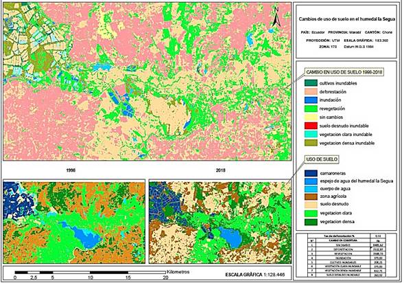 El área del estudio de caracterización socioambiental comprendió un total de 28 789 118 hectáreas, incluyendo tanto el humedal de La Segua como su entorno ambiental más próximo. Con el análisis SIG y de imágenes de satélite (Figura 1) se pudieron determinar los cambios más significativos en los usos del suelo experimentados en las dos últimas décadas y confirmar los impactos ambientales detectados en el trabajo de campo y referidos en la Tabla 1. En concreto, se pudo determinar una pérdida de un 35.9 % de los cuerpos de agua, un proceso importante de deforestación que ha afectado a un total 3 132.87 hectáreas de vegetación, lo que supone un porcentaje de pérdida de capa vegetal superior a tasa de deforestación media nacional estimada en un 0.11 %. Estos datos de deforestación pudieran parecer contradictorios con los resultados de los datos obtenidos sobre revegetación de un total de 3 508.73 hectáreas, pero ello tiene su explicación en la verificación de información realizada in situ, que registró la sustitución de la cobertura boscosa inicial por plantaciones de palmas inicialmente interpretadas como superficies de revegetación. El dato de inundación obtenido de 379 83 hectáreas representa el incremento de las áreas para uso acuícola (camaroneras) en zonas aledañas al humedal; mientras que la vegetación clara y densa inundable resulta de dos factores ambientales: el primero, de origen natural, derivado del cambio de cursos de cuerpos de aguas (ríos) o el surgimiento de nuevos cuerpos de aguas (ciénagas) como consecuencia de las lluvias, tal como se puede apreciar particularmente en el NE de la zona de estudio; y el segundo, de carácter antrópico, como resultado de la tala de cobertura boscosa para la creación de estanques artificiales para camaroneras, sobre todo en la zona NW del humedal.