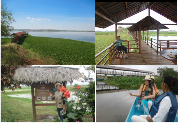 Este Ministerio, y otras entidades y ONG nacionales e internacionales han puesto en marcha algunos equipamientos de uso público en el entorno del humedal, pero sin implicación y colaboración interadministrativa del Ministerio de Ambiente de Ecuador, y sin ningún soporte efectivo y estructurado de promoción y comercialización, por lo que las iniciativas siempre han sido un tanto escasas, puntuales y descoordinadas, sin siquiera evaluación previa de impactos. En el paisaje acuático del humedal, tan sólo desde 2010 se han puesto en marcha algunas iniciativas novedosas en cuanto a equipamientos, pero han resultado ser insuficientes para afianzar este espacio protegido como el principal destino de naturaleza de Manabí, pese a sus potencialidades reales para serlo. Nos referimos, en este sentido, al sendero Los Caimanes, que incluye una pasarela de madera sobre las aguas y una torre que funciona como mirador para disfrutar de uno de los grandes atractivos del lugar: la ornitología y la avifauna (Figura 3). Estos trabajos fueron financiados por la Agencia de los Estados Unidos para el Desarrollo Internacional (USAID), con la colaboración del municipio de Chone, que aportó maquinaria para rellenar el sendero, así como del Ministerio de Turismo, que construyó el mirador actualmente existente. Existe, asimismo, un muelle con canoas y chalecos salvavidas, donde se organizan algunas actividades; pero la oferta de servicios en las zonas aledañas es muy limitada; se cuenta con pequeños restaurantes y casas de comida, pero sin ningún establecimiento de hospedaje.