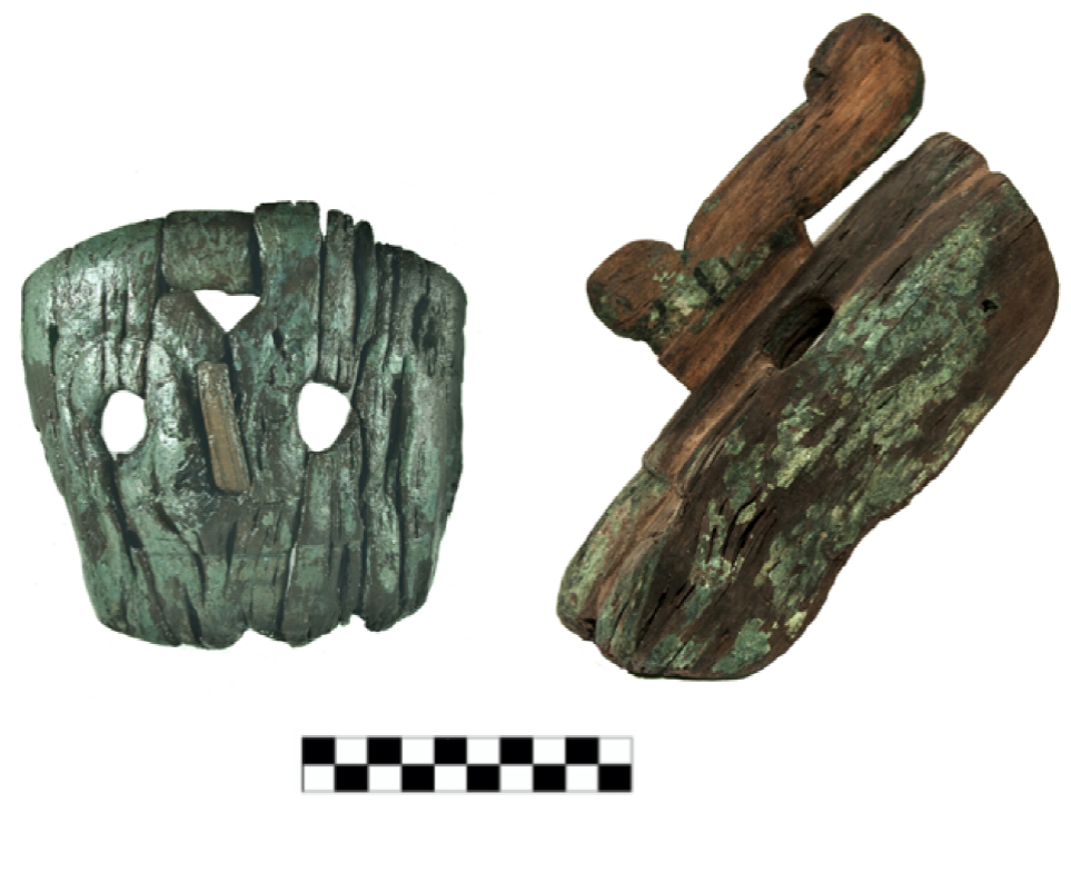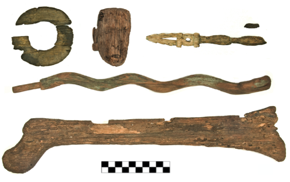 Once the wooden objects have been stabilized, and as a result of their preliminary analysis, they are catalogued according to their use, form and symbolism. The collection consists of: darts, spear-throwers, breastplates, earrings, masks, ornaments, ear flares (orejeras), scepters, Tlaloc jugs, headdresses, one representation of a flower and another of a bone (V. E. Cortés Meléndez, personal communication, February 2021). The specific analysis and the link between the different wooden objects being studied and the other gifts within each offering will enable us to establish their symbolism more accurately (Figure 3).