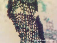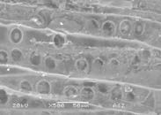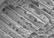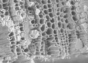 The elements seen on the longitudinal cuts are vessels with scalariform perforated plaques (plates); the presence of vessel-ray pits similar to those of the vessels and libriform fibers and uniseriate rays.