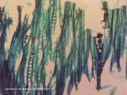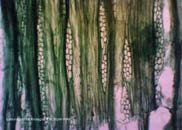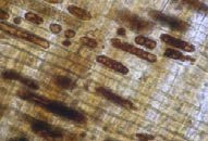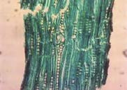 Tracheids In cross section, they make up early wood and late wood. In longitudinal view they are connected to each other at the cell wall by areolate scores. ㅤ Parenchymal cells They are seen in cross section as epithelial cells of the resin canals. In tangential cut they are interconnected with each other by simple punctuations. Depending on the position of the tree, they are observed as longitudinal parenchyma (vertical or axial) and radial parenchyma (radiums or rays). In radial section, the crossover field is generated by the union of tracheids with spokes. |