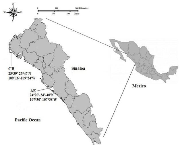 El estudio fue realizado en dos sitios localizados en la ribera norte-central de Sinaloa: Bahía El Colorado (CB), (25°39’-25°47’N, y 109°16’-109°24’W), y Estero Las Aguamitas (AE), (24°20’-24°40’N, y 107°30’-107°58’W) (Figura 1).