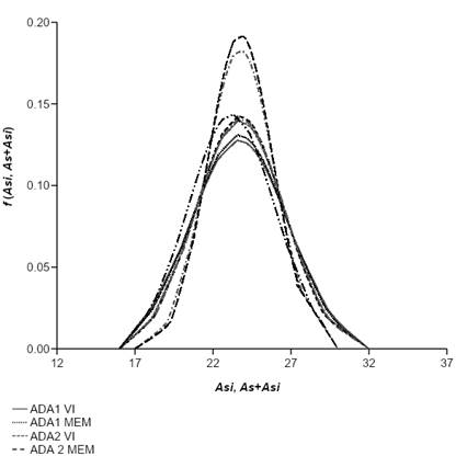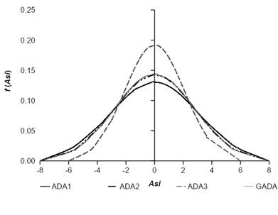 Figura 2 Función de distribución normal de los parámetros aleatorios (As i ) de las ecuaciones de diferencia algebraica (ADA) y diferencia algebraica generalizada (GADA) con modelos de efectos mixtos (MEM).