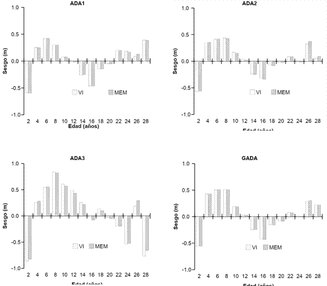 En general, las ecuaciones ADA con VI fueron relativamente superiores a las ajustadas con MEM. En las ecuaciones ADA, el valor de R2 fue mayor (98.58 %) y el de la RCME menor (1.17 m) en la ecuación ADA2 (ecuación 2) con VI, aunque con MEM presentó el menor sesgo. Por otro lado, la ecuación GADA (ecuación 4) ajustada con MEM presentó el valor más alto de R2 (98.66 %) y el menor en la RCME (1.14 m); no obstante, el sesgo fue menor con el enfoque de VI (Cuadro 3).