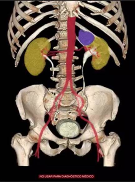 Imagen 1 Reconstrucción 3D de TAC, donde se aprecia tumoración suprarrenal izquierda (marcada de color azul).