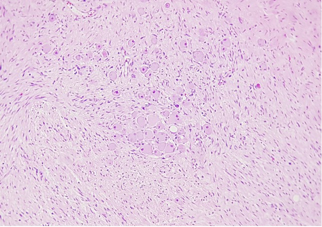 Su descripción microscópica consiste en una mezcla de células ganglionares y células de Shwann. Las células ganglionares pueden ser maduras, caracterizadas por citoplasma eosonófilo, compactas, con un único núcleo excéntrico y un nucléolo prominente ó dismórficas, con un núcleo picnótico único o múltiple. Este tipo de células varían en distribución y numero, y pueden encontrarse dispersas. Es posible que contengan pigmento dorado o café granular fino. Las células de Shwann se encuentran envainando los procesos neuríticos y se organizan en pequeñas intersecciones de fascículos separados por estroma mixoide.13