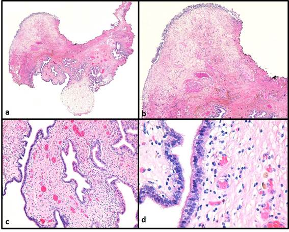 Fig. 2 Imagen anatomopatológica objetivada mediante microscopía óptica: a) Mucosa urotelial con lesión exo-endofítica, con corion edematoso y glándulas. b) A mayor aumento, cambio del epitelio urotelial habitual por epitelio cilíndrico. c) Epitelio de revestimiento cilíndrico ciliado, con células intercaladas. d) Dicho epitelio a mayor detalle citológico.