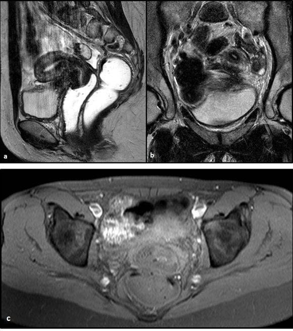 Fig. 3 RM pélvica: Secuencia sagital (a) y coronal (b) T2SE y transversal T1 supresión grasa (c). a) y b) Nódulo hipointenso de que infiltra la serosa uterina anterior, la plica vesicouterina, y de forma transmural la cúpula vesical posterosuperior protruyendo hacia la luz vesical con algún elemento glandular microquístico en el interior. c)los pequeños elementos glandulares, aparencen brillantes en secuencia T1 por componente glandular hemorrágico.