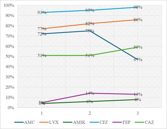 AMC: amoxicilina/ácido clavulánico, AMIK: amikacina, CAZ: ceftazidima, CFZ: cefazolina, FEP: cefepima, LVX: levofloxacino.