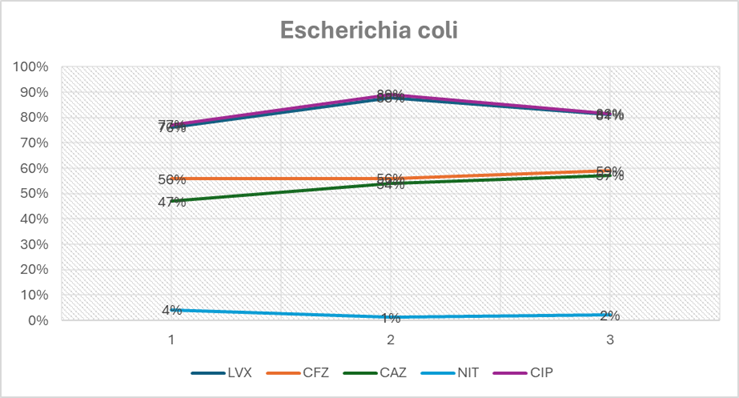 Existió un incremento del porcentaje de resistencia de Escherichia coli de manera significativa para levofloxacino (X2 Tend=9.7277, p=0.0018), cefazolina (X2 Tend=5.0878, p=0.0241), ceftazidima (X2 Tend=4.5501, p=0.0329) y ciprofloxacino (X2 Tend=3.5606, p=0.0592). Se identifico aumento de la sensibilidad para nitrofurantoina (X2 Tend=3.8388, p=0.0501).