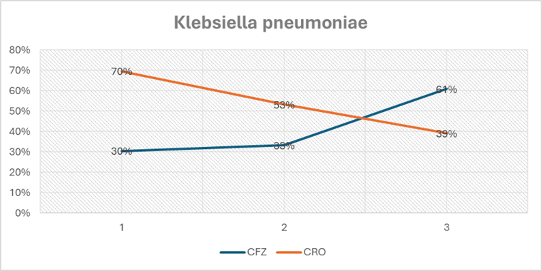 Con respecto a Klebsiella pneumoniae, existió un incremento del porcentaje de resistencia para cefazolina (X2 Tend=4.2842, p=0.0385). Se identifico un aumento de la sensibilidad para ceftriaxona (X2 Tend=3.88, p=0.0489) (Gráfica 4).