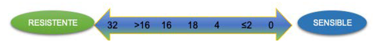 En un análisis final, se pretende diferenciar si la resistencia es alta (mientras más de aleja del 0) o sensibilidad alta (mientras más se acerca a 0) (Imagen 1). Para ello, el reporte de sensibilidad a 20 antibióticos que envió el laboratorio sirvió para definir el nivel de resistencia alta >16 y resistencia baja ≤16; se definió sensibilidad alta ≤2 y sensibilidad baja >2 (Tabla 2).
