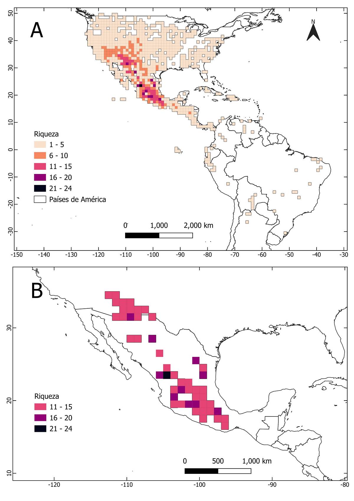 Análisis de riqueza de especies y endemismo. México presenta las celdas con los valores más altos de riqueza de especies, destacando celdas con hasta 24 especies, ubicadas en el norte del país (Figura 1A y 1B, Material Suplementario 3 Tabla S3, Material Suplementario 1 Figura S3). De manera general, a lo largo del territorio mexicano se observan celdas que contienen más de 10 especies. El suroeste de Estados Unidos de América también muestra altos niveles de riqueza, con celdas que contienen entre 11 y 15 especies (Figura 1B). En contraste, las celdas con valores de riqueza relativamente bajos (entre 1 y 10 especies) se encuentran principalmente en Centro y Sudamérica, así como en el norte de Estados Unidos de América y Canadá (Figura 1A, Material Suplementario 1 Figura S3, Material Suplementario 3 Tabla S3).