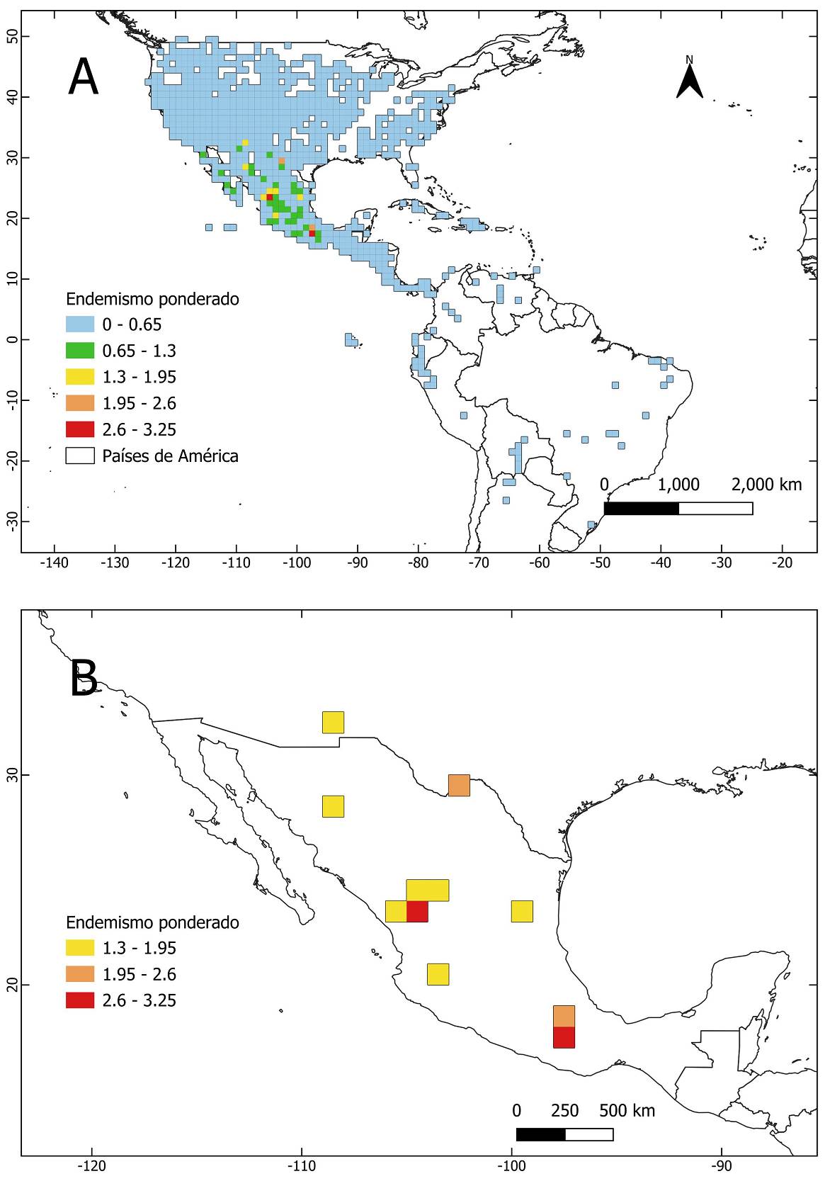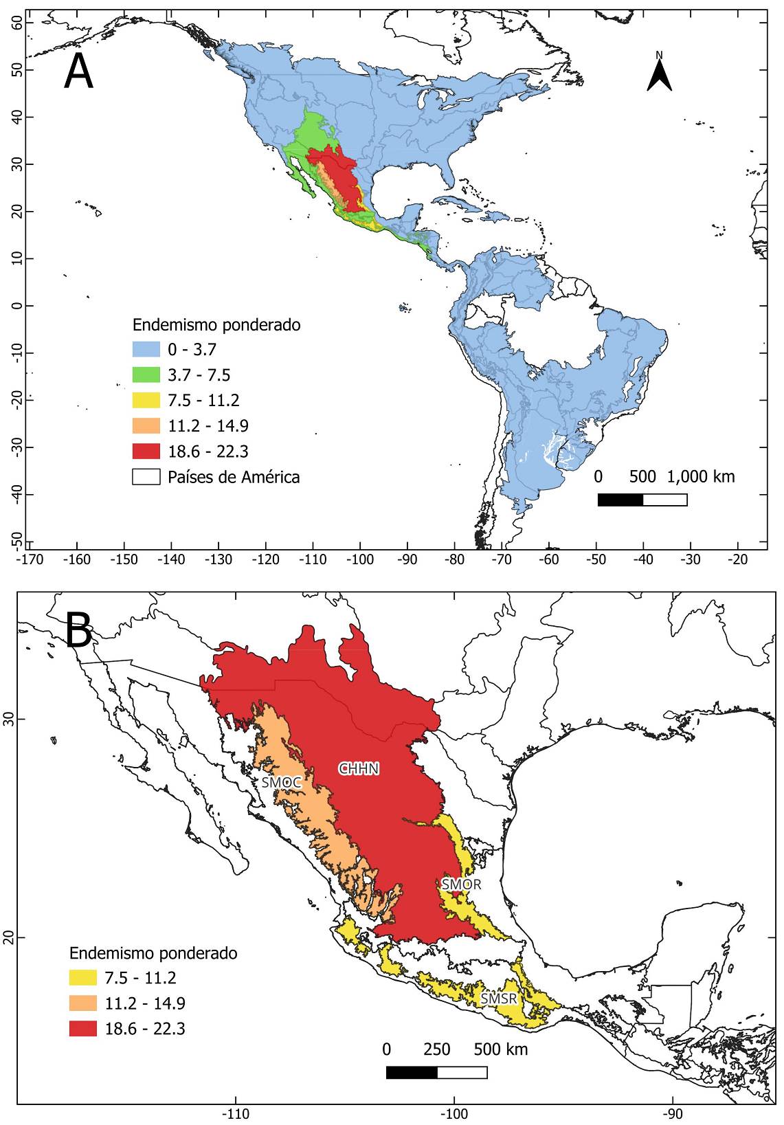 Al igual que la riqueza de especies, los valores más altos de endemismo ponderado se encuentran en México (Figura 3A y 3B, Material Suplementario 1 Figura S3, Material Suplementario 3 Tabla S3). En contraste, las celdas ubicadas en Centro y Sudamérica, así como en Estados Unidos y Canadá, presentan valores bajos de endemismo ponderado (Figura 3A). La provincia Chihuahuense presenta el valor más alto de endemismo ponderado, seguida por la Sierra Madre Occidental, la Sierra Madre del Sur y la Sierra Madre Oriental (Tabla 1, Figura 4A y 4B). Por el contrario, las provincias de Canadá, Estados Unidos de América, Centro y Sudamérica, así como algunas provincias mexicanas presentan valores relativamente bajos de endemismo ponderado (Figura 4A, Material Suplementario 3 Tabla S4).
