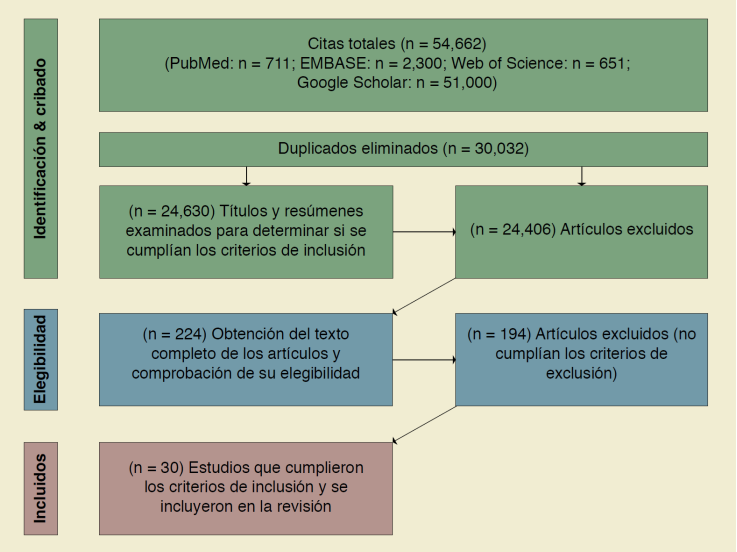 Resultados de la búsqueda: De los 54,662 artículos identificados al buscar en bases de datos electrónicas, 30 cumplieron con los criterios de inclusión (Figura 1).