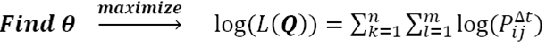 No presente estudo, recorre-se à função fmincon (constrained nonlinear optimization) presente no software MATLAB para obter a matriz intensidade (Q), que permite obter a transição entre estados de degradação, em função do estado original e da taxa de transição entre o estado actual e o estado futuro. Com base nas taxas de transição entre condições de degradação, a probabilidade de transição entre estados de degradação pode ser obtida de acordo com a equação diferencial de Chapman-Kolmogorov. A matriz intensidade é obtida através da maximização do algoritmo de verosimilhança (Carrington et al., 2005), tal como representado na equação (1), sendo, para isso, utilizado no presente estudo o algoritmo numérico de conjunto activo (active-set numerical algorithm presente na função fmincon) (Kalbfleisch e Lawless, 1985). No presente estudo, com o objectivo de melhorar a estabilidade do algoritmo de optimização, é maximizado o algoritmo de verosimilhança (Fletcher e Powell, 1963; Higham e Higham, 2005), tal como representado na equação (1). A matriz Q obtida para os revestimentos pétreos é dada pela equação (2).
