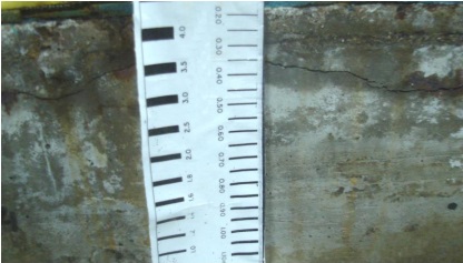 Primeiramente, as vigas foram carregadas e antes do início de molhagem, foram medidas as fissurações de flexão iniciais. O monitoramento da superfície das vigas foi realizado através da observação diária e registando o momento de aparição das primeiras manchas e das primeiras fissuras por corrosão. A partir do surgimento destas primeiras fissuras, foi realizada periodicamente a medição da largura (por comparação com uma régua graduada, com uma divisão mínima de 0,05 mm (ver Figura 2) e ao longo das mesmas (com uma régua graduada, que tem uma precisão milimétrica). Este procedimento foi realizado para encontrar as larguras máximas de fissuras, e as áreas de fissuração, obtidas com a soma dos comprimentos de cada fissura, multiplicadas pela sua respectiva largura.