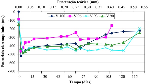 Figura 3 Potenciais de corrosão médios (zona hidratada), em função da penetração teórica e de tempo.