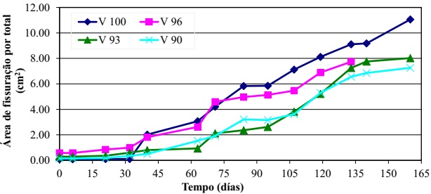 Uma vez que as cargas externas foram aplicadas, iniciou-se a medição das fissuras. Na Figura 5 se apresenta a evolução das áreas de fissuração totais em cada viga; isto é, aquelas obtidas pela soma das áreas de fissura por flexão e da fissuração por corrosão (na mesma direção que a armadura principal da viga). Vale lembrar que a chamada Área de Fissuração é a somatória dos produtos do comprimento pela largura de cada fissura.