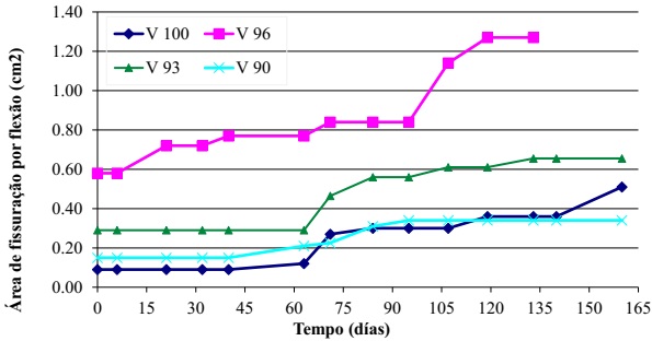 Como era esperado, o aparecimento das fissuras de corrosão se manifestou mais tarde nas vigas com maior cobrimento. As vigas V90 e V93 tiveram uma evolução de área de fissuração total semelhante durante o tempo de ensaio, tendo em conta o grau de dispersão que geralmente aparece na maior parte dos trabalhos experimentais; enquanto que as vigas V96 e V100 mostraram um comportamento diferente, com áreas de fissuração totais superiores às vigas restantes, por apresentar uma relação r/ϕ mais baixa das armaduras. No entanto, quando analisado em separado a área de fissuração por flexão (Figura 6), verifica-se que a viga V96 apresentou valores muito superiores aos demais; isto é claramente visto no estado em que a viga chegou, onde a deterioração por corrosão ocorreu mais na zona das fissuras por flexão, enquanto o resto das vigas apresentou uma fissuração mais generalizada. Obviamente, esta maior fissuração inicial devida à flexão foi um importante via de entrada de cloretos, que chegaram até a armadura, apresentando a viga V96 as maiores áreas de fissuração total (Figura 5), durante os primeiros 30 dias de ensaio, em seguida, o seu comportamento esteve dentro das expectativas.