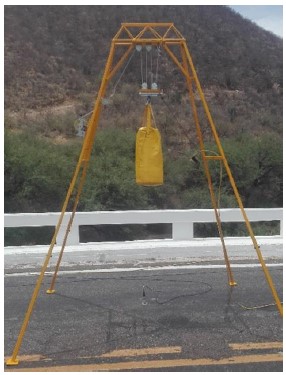 Las mediciones en campo se hicieron usando una estructura de elevación y descarga de las masas de excitación, el equipo consiste en un esqueleto cuadrúpedo que permite elevar las masas mediante un winche con capacidad para 2250 N; el mecanismo de sujeción de los contenedores está formado por un electroimán de 6 KN de capacidad que permite engarzar la masa de excitación mediante gancho de seguridad con un grado de libertad a la torsión, (fig. 8).