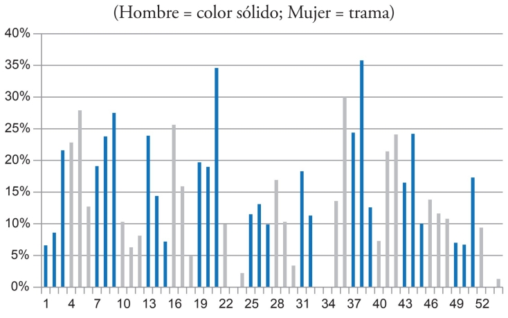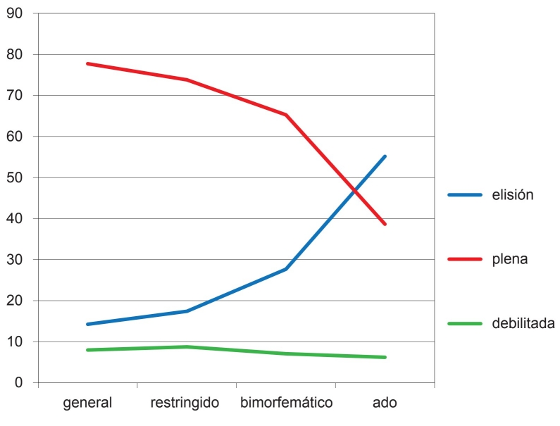 La figura 1 ilustra cómo en el contexto más restrictivo (-ado) el patrón conservador se invierte, de manera que la elisión, que en el contexto general presenta frecuencias relativamente bajas, en -ado supera a la conservación de la dental (55.15%), sumando la realización plena y la debilitada.7 Se trata de un porcentaje muy elevado si se tiene en cuenta que la madrileña es una comunidad fonéticamente conservadora y especialmente el barrio de Salamanca, donde el comportamiento en relación con el segmento que estudiamos ha sido tradicionalmente conservador. De esta manera, resulta evidente que en la comunidad madrileña el entorno más propicio a la elisión es -ado, sobre todo cuando se trata de un participio, y que ha de ser este el entorno que haya de tenerse en cuenta en el estudio del cambio en esta comunidad.