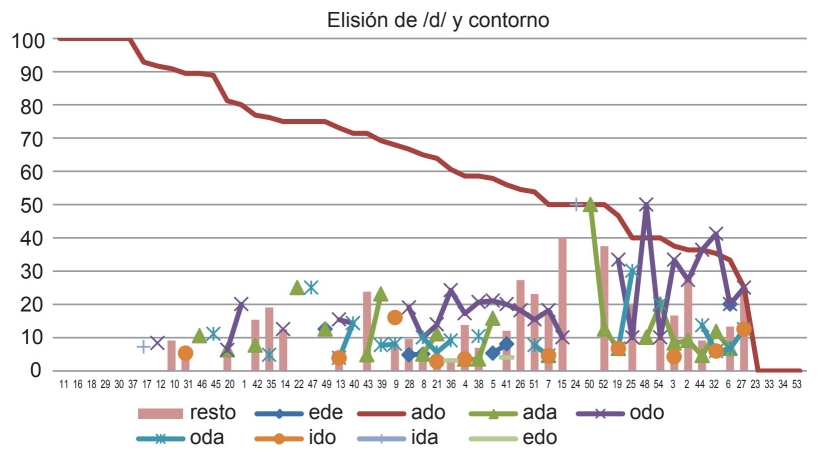 El análisis escalonado de los cuatro entornos (tabla 1), permite ver el progreso de la elisión, más acusada a medida que se restringe el contexto fónico; así, se pasa de un 14.29% en el entorno general a un 17.44% en el restringido, un 27.65% cuando la dental forma parte del morfema y un 55.15% en la terminación -ado.
