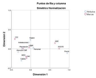 CMR: siendo la que tiene relación con cinco de los siete atributos como lo es la calidez, la atención, el personal, las instalaciones y la reputación teniendo con esta ultima una menor distancia, además de que esta institución de salud se identifica en el análisis como la marca líder del mercado en Rioverde.