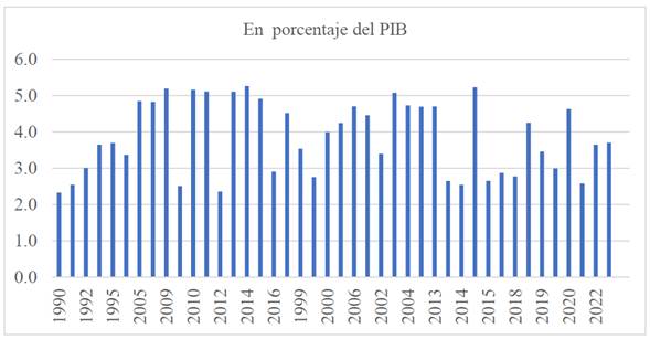 En lo que se refiere al gasto público como porcentaje del PIB, la figura 3 muestra cómo se comporta dicha variable desde el año 1990 hasta el presente. En poco más de 30 años, el crecimiento ha pasado del 2.4 al 3.7, lo cual evidencia que, si bien se ha incrementado dicho gasto, cuanto han hecho varias administraciones de gobiernos de México es a toda luz insuficiente en vista de las necesidades que presenta este rubro.