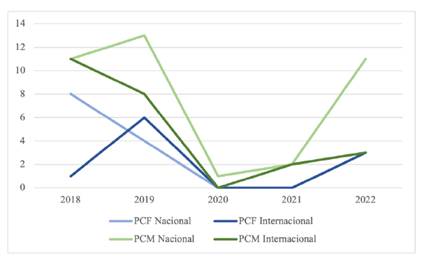 En cuanto a la movilidad académica, la pandemia generó una interrupción significativa en ambos programas, aunque con dinámicas diferentes. En el PCF, la movilidad estudiantil se redujo a cero en 2020 y 2021, una caída sin precedentes que no solo afectó la formación de los estudiantes, sino que también amenazó la red de colaboraciones internacionales del programa. Por otro lado, el PCM logró una reactivación parcial en 2021, principalmente a nivel doctoral y con destinos nacionales (Fig. 1). Esta reorientación, aunque pragmática, afecta la calidad de la experiencia internacional y reduce la creación de redes de colaboración globales. Asimismo, esta situación restringió el acceso a tecnologías y metodologías de vanguardia que suelen estar disponibles solo en instituciones internacionales, limitando así el desarrollo académico de los estudiantes.