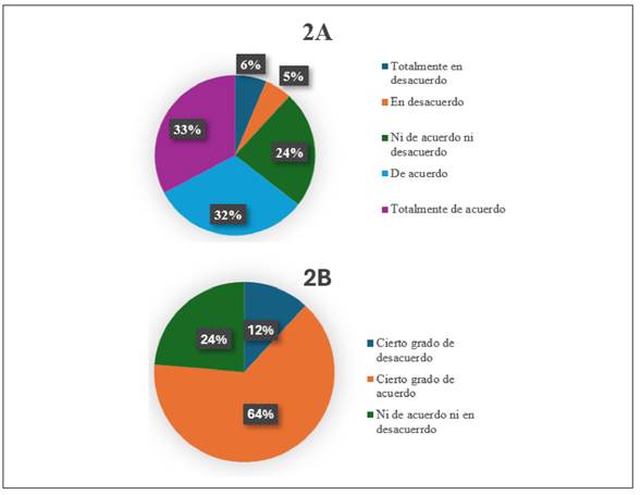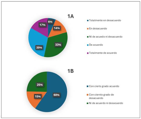 Quienes permanecieron con una actitud neutral, es decir, ni en desacuerdo ni de acuerdo, fueron 115 (25 %) (Figura 1B). Conjuntando las respuestas en las que evidencia que los estudiantes tienen cierto grado de acuerdo con (60 %) de los encuestados, en tanto que aquellos que están ni de acuerdo ni en desacuerdo alcanzaron (25 %). El porcentaje restante corresponde a aquellos que están en cierto grado desacuerdo con (15 %).