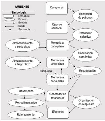 El modelo de procesamiento de información describe cómo los estímulos externos son transformados en aprendizajes significativos a través de etapas interrelacionadas. Este proceso (ver figura 2) inicia en el registro sensorial, donde los estímulos del entorno son capturados y filtrados mediante la percepción selectiva para identificar aquellos relevantes. Los datos seleccionados se transfieren a la memorua de corto plazo (MCP), donde son organizados temporalmente. Estrategias como la repetición y la asociación facilitan su consolidación.