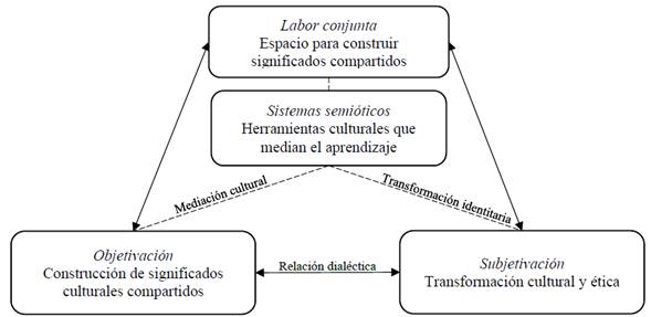 La TO se fundamenta en tres pilares principales: objetivación, subjetivación y labor conjunta, los cuales se entrelazan para explicar cómo emergen los procesos de aprendizaje en contextos históricos y culturales. En la figura 3 se ilustra la dinámica entre estos pilares y los sistemas semióticos que los median.