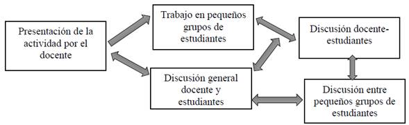 Como se presenta en la figura 4, la interacción en el aula mediada por la estructura Φ se desarrolla en tres momentos interrelacionados. En la etapa inicial, los estudiantes trabajan en pequeños grupos, explorando problemas contextualizados con herramientas semióticas como diagramas o esquemas, mientras el docente facilita la reflexión crítica. Posteriormente, los grupos comparten y discuten sus ideas, favoreciendo el diálogo y la integración de perspectivas que enriquecen el conocimiento colectivo. Finalmente, en una discusión plenaria liderada por el docente, se sintetizan las contribuciones grupales y se consolidan los aprendizajes, vinculando los procesos individuales con el colectivo en un saber compartido.