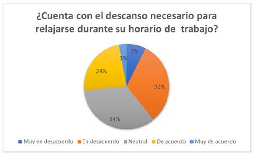b) Los resultados de la encuesta muestran que el 34 % de los encuestados se sienten neutrales respecto a si cuentan con el descanso necesario para relajarse durante su horario laboral. Un 32 % está en desacuerdo y un 7 % muy en desacuerdo, lo que sugiere que una proporción significativa de los trabajadores considera insuficiente el tiempo destinado al descanso. Por otro lado, el 24 % está de acuerdo y solo el 3 % muy de acuerdo, lo que indica que una minoría percibe su descanso como adecuado. Estos resultados reflejan la necesidad de mejorar las oportunidades de descanso durante la jornada laboral para la mayoría del personal. (Figura 10)