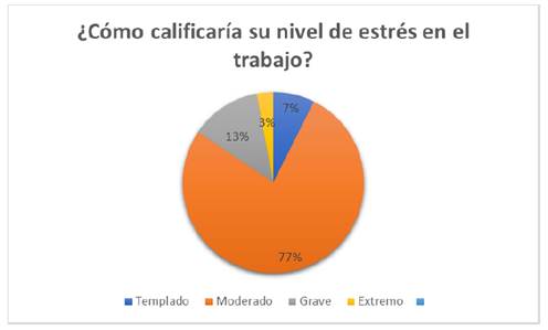 Más del 50 % de los encuestados consideran que su nivel de estrés laboral no es extremo. Los factores que contribuyen a esta percepción incluyen no llevar trabajo a casa, no experimentar dificultades para conciliar el sueño, considerar la carga de trabajo tolerable y lograr desconectarse del entorno laboral al llegar a casa. Además, el trabajo realizado no les genera frustración.