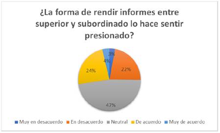 d) El 47 % de los encuestados expresó una postura neutral respecto a la percepción de presión derivada de la forma en que se presentan informes entre superiores y subordinados. Un 24 % está de acuerdo y un 4 % muy de acuerdo, lo que indica que una parte significativa del personal percibe cierto nivel de presión en esta dinámica. En contraste, el 22 % está en desacuerdo y el 3 % muy en desacuerdo, lo que sugiere que una minoría no experimenta dicha presión. Estos resultados reflejan una diversidad de opiniones sobre la dinámica de rendición de informes en el entorno laboral. (Figura 12)