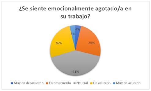 El 41% de los colaboradores administrativos indicó que su nivel de agotamiento emocional se encuentra dentro de la categoría neutral, según la escala utilizada en la encuesta. Esto sugiere que no experimentan emociones extremas, ni positivas ni negativas, en relación con su carga laboral.