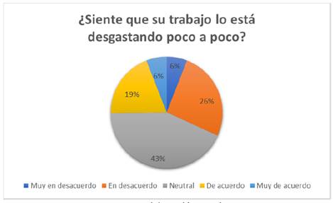 f) El 43% de los encuestados reportó sentirse neutral respecto a si su trabajo los está desgastando poco a poco. Un 19% indicó estar de acuerdo y un 6% muy de acuerdo, lo que sugiere que una parte significativa de los trabajadores experimenta algún nivel de desgaste. Por otro lado, el 26% expresó estar en desacuerdo y el 6% muy en desacuerdo, lo que indica que una minoría no percibe desgaste en su trabajo. Estos resultados reflejan una diversidad de opiniones sobre el impacto del trabajo en el bienestar de los empleados (Figura 14).