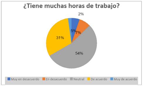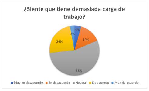 g) Los resultados indican que el 55% de los encuestados reportó sentirse neutral respecto a su carga de trabajo. Un 24% expresó estar de acuerdo y un 3% muy de acuerdo, lo que sugiere que una parte de los trabajadores percibe su carga laboral como elevada. En contraste, el 14% manifestó estar en desacuerdo y el 4% muy en desacuerdo, lo que indica que una minoría considera que su carga de trabajo no es excesiva. Estos datos evidencian percepciones variadas sobre la intensidad del trabajo asignado (Figura 15).