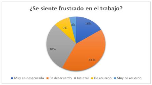 h) El 41% de los encuestados indicó estar en desacuerdo con la afirmación de que se sienten frustrados en el trabajo, lo que sugiere que una parte significativa de los trabajadores no experimenta frustración laboral. Un 30% se mostró neutral respecto a este aspecto, mientras que el 16% expresó estar muy en desacuerdo. Por otro lado, el 9% manifestó estar de acuerdo y el 4% muy de acuerdo, lo que indica que una minoría sí experimenta frustración en el entorno laboral. Estos resultados permiten observar distintos niveles de percepción sobre esta variable emocional (Figura 16).
