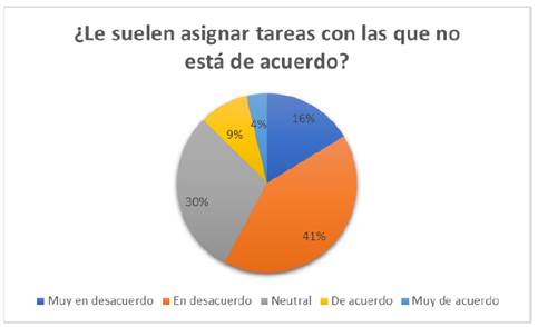i) El 41 % de los encuestados indicó estar en desacuerdo con la afirmación de que suelen recibir tareas con las que no están de acuerdo. Un 30 % se mostró neutral respecto a este aspecto, mientras que el 16 % expresó estar muy en desacuerdo. Por otro lado, el 9 % manifestó estar de acuerdo y el 4 % muy de acuerdo, lo que indica que una minoría percibe desacuerdo con las tareas que se les asignan. Estos resultados reflejan distintas percepciones sobre la alineación entre las tareas asignadas y las expectativas de los trabajadores (Figura 17).