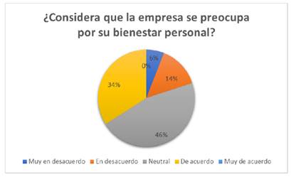 k) El 46 % de los encuestados se mostró neutral respecto a si la empresa se preocupa por su bienestar personal. Un 34 % indicó estar de acuerdo, lo que sugiere que una parte significativa de los trabajadores percibe una preocupación genuina por parte de la organización. En contraste, el 14 % expresó estar en desacuerdo y el 6 % muy en desacuerdo, lo que indica que una minoría no percibe dicha preocupación. Ningún encuestado seleccionó la opción “muy de acuerdo”. Estos resultados evidencian percepciones diversas sobre el compromiso de la empresa con el bienestar personal de sus empleados (Figura 19).