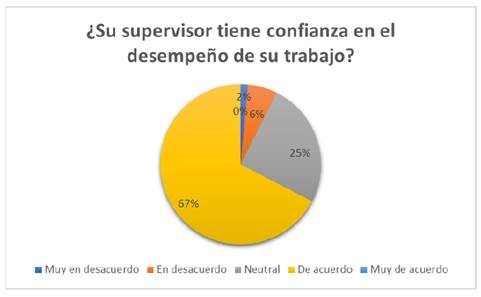 l) Los resultados de la encuesta indican que el 67 % de los encuestados está de acuerdo con que su supervisor confía en su desempeño laboral, lo que sugiere una percepción general positiva sobre la confianza del supervisor. Un 25 % se mostró neutral, mientras que el 6 % expresó estar en desacuerdo. Ningún encuestado seleccionó las opciones “muy en desacuerdo” ni “muy de acuerdo”. Estos resultados reflejan una alta percepción de confianza por parte del supervisor hacia los empleados (Figura 20).