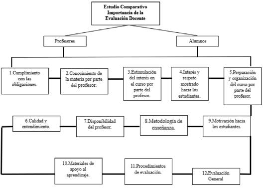 Es por eso que de lo aportado se toma en cuenta el criterio valorado aplicando los ítems relacionados con su comportamiento, para dar continuidad a la importancia de la evaluación docente, destacando como punto de partida las doce dimensiones analizadas por los expertos: 1) Cumplimiento en el trabajo, 2) Conocimiento de la materia, 3) Estimulación del interés en el curso, 4) Respeto mostrado hacia los estudiantes, 5) Preparación y organización del curso, 6) Claridad en la enseñanza, 7) Disponibilidad del profesor, 8) Metodología de la enseñanza, 9) Motivación hacia los estudiantes, 10) Uso de materiales de apoyo, 11) Procedimientos de evaluación y 12) Evaluación general.