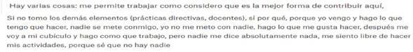 Como se observa en la Figura 10, si bien se enfatizan las cualidades de autonomía operativa y temporal, se revela, una crítica hacia el limitado seguimiento directivo al respecto, exceptuando la supervisión de la impartición de clases, por prefectura, el profesor se considera “libre”; aunque, como se observa en la Figura 11, el control del desempeño del profesor se verifica mediante de la evaluación docente.